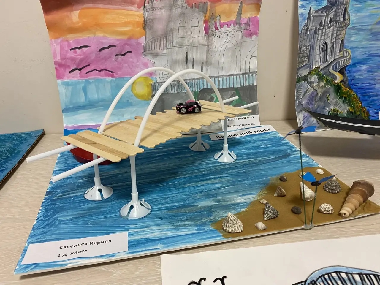 Юные художники и мастера посвятили свои работы этому важному историческому событию. В экспозиции можно увидеть рисунки с видами крымских достопримечательностей — Ласточкина гнезда, Херсонеса, живописных морских пейзажей, а также тематические поделки, символизирующие дружбу и единство народов.