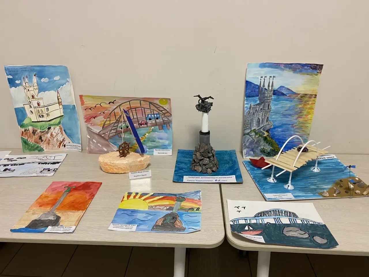Юные художники и мастера посвятили свои работы этому важному историческому событию. В экспозиции можно увидеть рисунки с видами крымских достопримечательностей — Ласточкина гнезда, Херсонеса, живописных морских пейзажей, а также тематические поделки, символизирующие дружбу и единство народов.