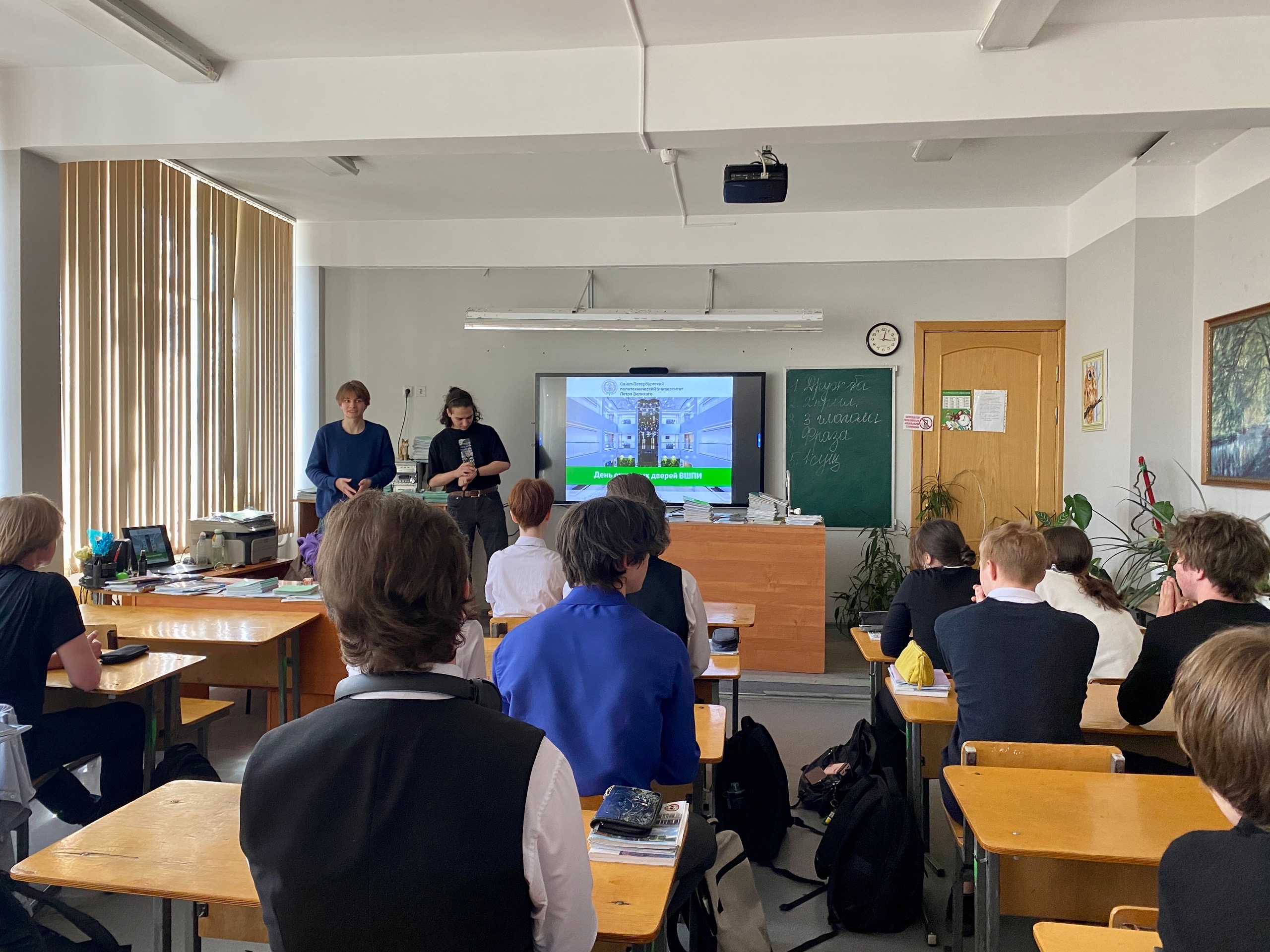 К нам пришли Карпов Гавриил и Оганесян Давид — нынешние студенты Политехнического университета. Ребята поделились с учениками 10–11 классов своим опытом поступления и учёбы в вузе.