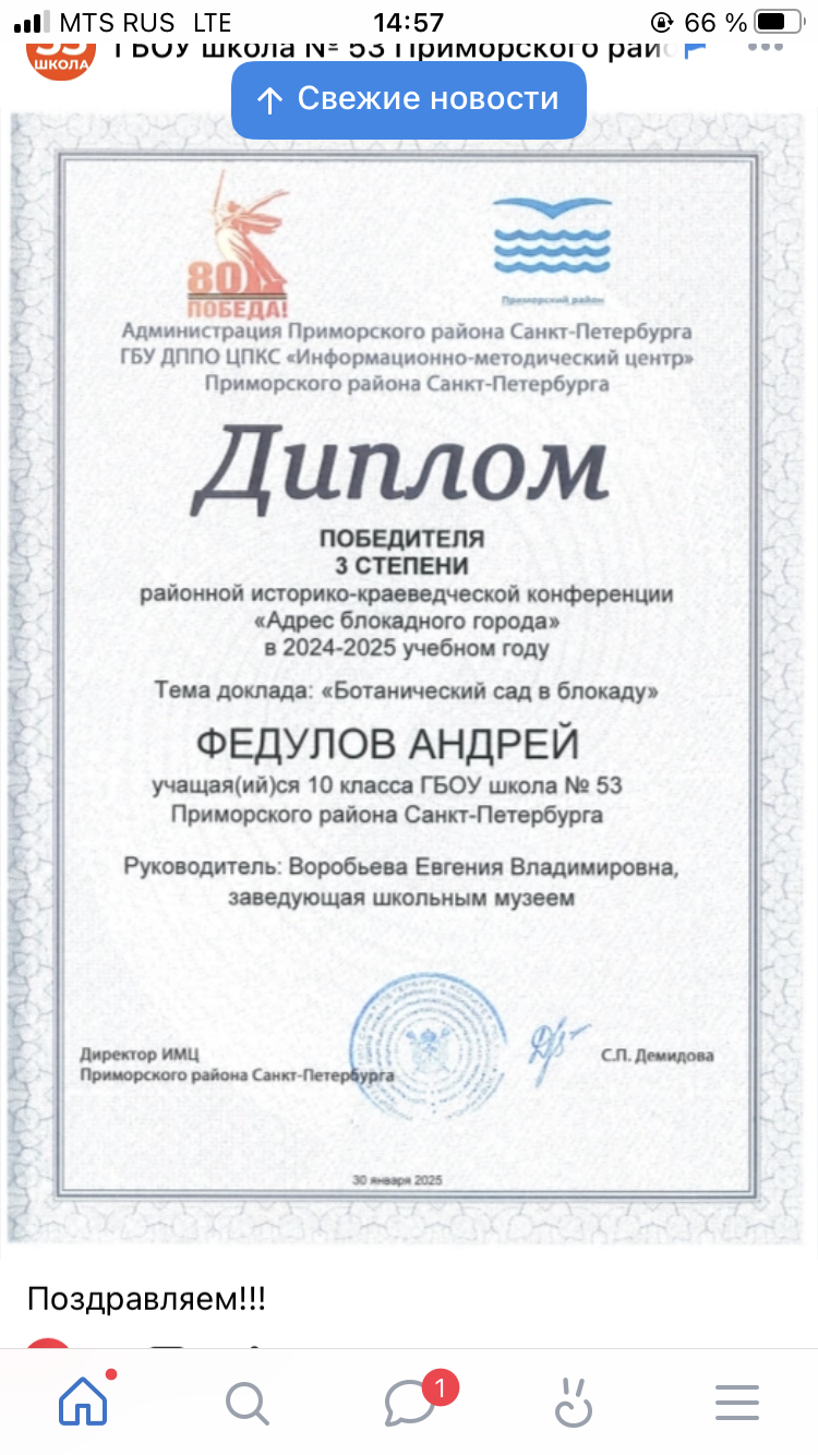 Вторым важным аспектом этой деятельности является участие ребят в различных районных и городских конкурсах. В 2024-2025 учебном году председатель школьного музейного клуба Гавриил Карпов (теперь уже выпускник нашей школы) показал прекрасные результаты в районных(Iместо) и городских (IIIместо) турах конкурсов «Лучший юный экскурсовод года», «Лучший юный экскурсовод школьных музеев», команда нашего клуба получила Диплом IIстепени в городской музейно-исторической игре «Мосты Санкт-Петербурга. Вчера. Сегодня. Завтра». На районной конференции «Адреса блокадного города» получил диплом IIIстепени Андрей Федулов, а Даяна Аристова-Осипова получила диплом за 2 место в литературно-краеведческом конкурсе «Давно стихами говорит Нева», сняв видео о Пушкинских местах Санкт-Петербурга. Даниил Адрианов получил Грамоту за IIIместо в районном творческом проекте «Мой любимый Приморский».